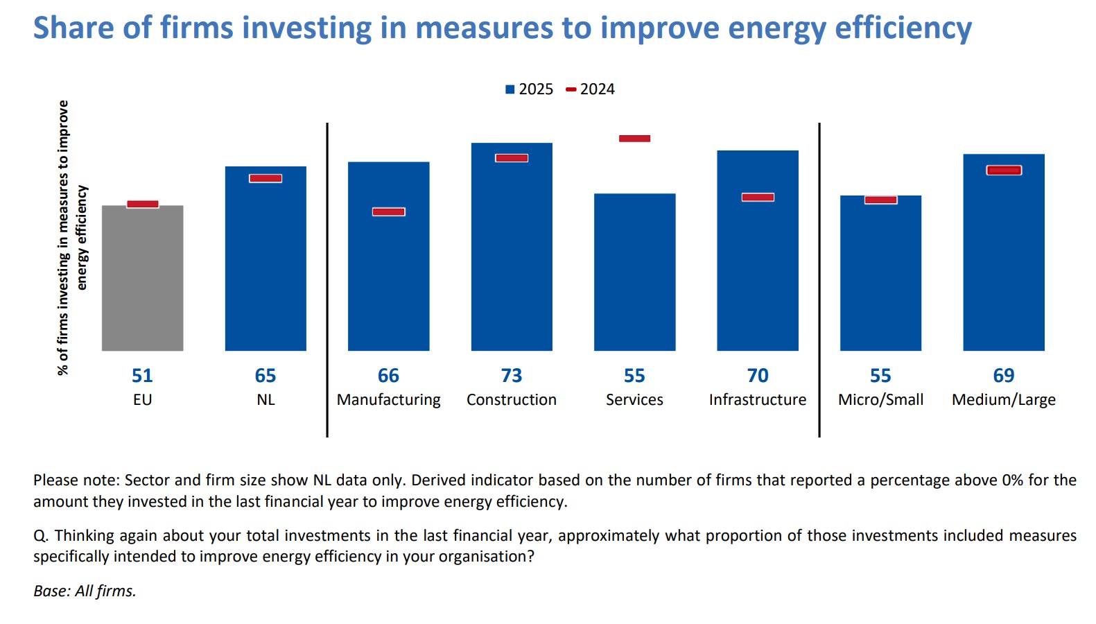 Andere investeringsbelemmeringen zijn onder meer de beschikbaarheid van gekwalificeerd personeel (genoemd door 89% van de Nederlandse respondenten), onzekerheid over de toekomst (72%), regelgeving (66%), energiekosten (53%) en transportinfrastructuur (25%). Over het algemeen blijft het investeringssentiment in Nederland echter positief en steekt het gunstig af bij de EU, ondanks de uitdagende wereldwijde omgeving. Meer dan negen op de tien Nederlandse bedrijven investeren (93%), wat boven het EU-gemiddelde van 86% ligt.