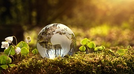 Environment conservation concept. Close up of glass globe in the forest with copy space