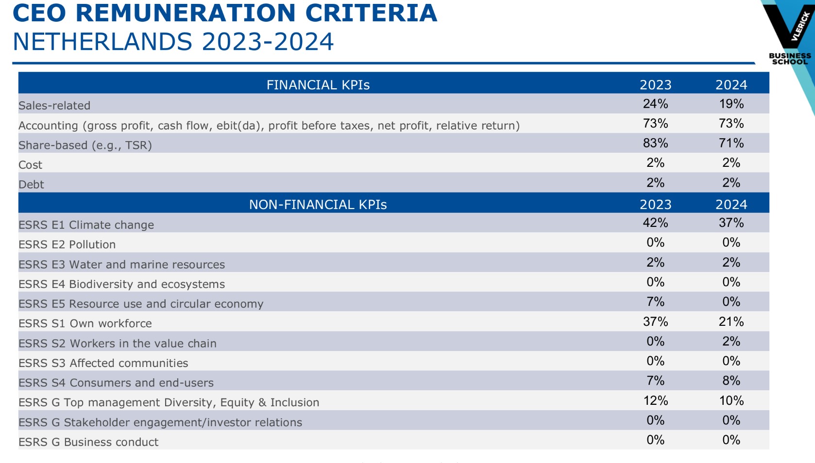Daarnaast waren er ook interessante bevindingen voor wat de onderliggende remuneratiecriteria betreft. We merken een evolutie naar een meer en beter evenwicht tussen financiële en niet-financiële criteria, wat ook aansluit bij de toegenomen complexiteit in de bedrijfscontext. We stellen jammer genoeg vast dat in Europa in 2024 minder Europese bedrijven duurzaamheidscriteria opnemen, en dan vooral op het vlak van emissies en diversiteit.”