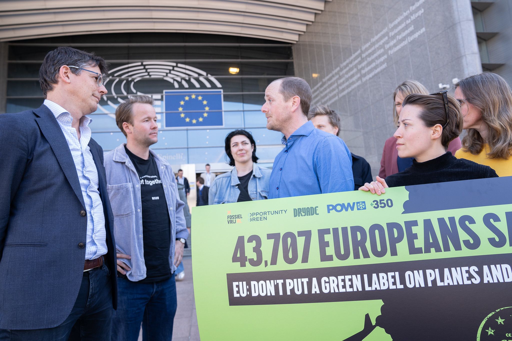 Meer dan 43.000 mensen door heel Europa tekenden een petitie – opgezet door Fossielvrij NL – waarin wordt geëist dat de Europese Unie fossiele schepen en vliegtuigen van de groene lijst haalt.