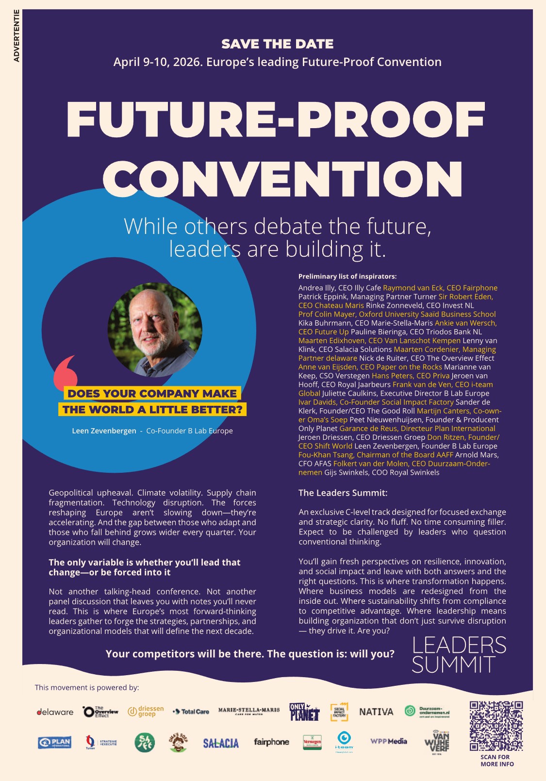 De Future Proof Leaders Summit 2026 wordt geleid door Leen Zevenbergen en zal plaatsvinden gelijktijdig met de Impact Trade Fair 2026.