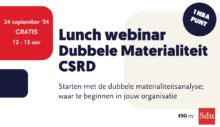 24/09/2024 @ 12:00 – 13:00 – Dubbele materialiteit = kern van de duurzaamheidsrapportage (CSRD) Binnen de Corporate Sustainability Reporting Directive (CSRD) – verplicht organisaties om een dubbele materialiteitsanalyse uit te voeren, maar wat is dit precies? Hoe zorg je ervoor dat je de analyse op de juiste manier aanpakt? Met deze analyse bepaal je welke onderwerpen voor jouw organisatie en stakeholders […]