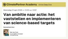 01/04/2026 @ 10:00 – 11:00 – Het stellen van Science-Based targets De druk neemt toe: investeerders, autoriteitenen en klanten vragen om echte actie, niet om loze beloften. Neem deel aan de Deep Dive van ClimatePartner en leer alles over het Science Based Targets initiative (SBTi), een van de erkende standaarden voor geloofwaardige klimaatactie. We maken de SBTi-vereisten inzichtelijk, zodat je met […]