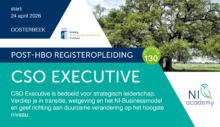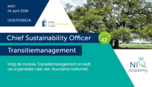 24/04/2026 @ 09:00 – 17:00 – Op vrijdag 24 april 2026 start de post-hbo Registeropleiding CSO Executive. Deze jaaropleiding van NI-academy is bedoeld voor professionals die strategisch richting willen geven aan duurzaamheid binnen hun organisatie. Je leert werken met strategische instrumenten en systemische benaderingen waarmee je de lange termijn duurzaamheidsdoelen van de organisatie waarmaakt. Je volgt drie verdiepende modules: Wet- & […]