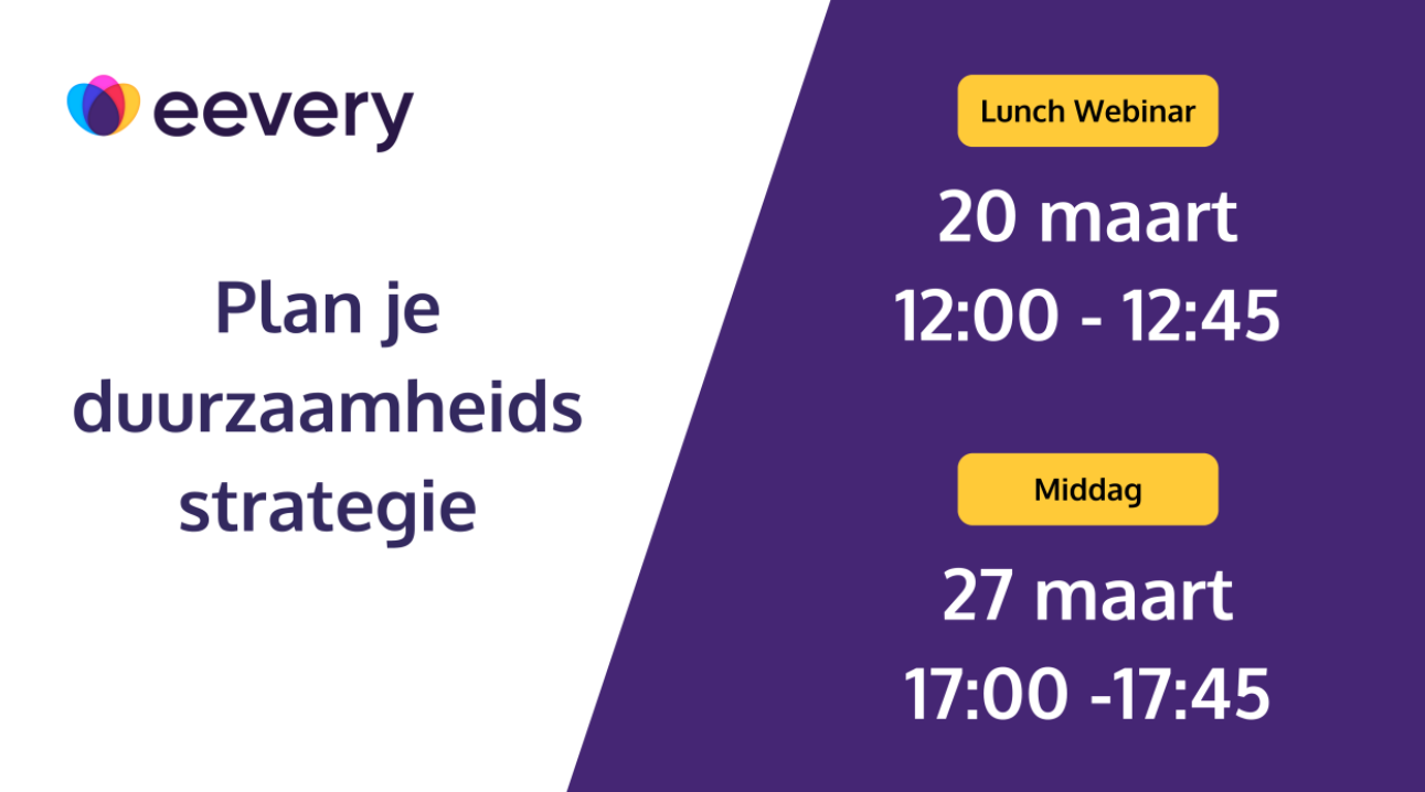 Op 20 & 27 maart organiseert Eevery een webinar om je op weg te helpen met een bedrijfsbrede duurzaamheidsstrategie. Het is geen geheim dat het bezitten van een duurzaamheidsstrategie anno 2024 een must is. In deze Lunch webinar van 45 minuten geven we je efficiënte en tastbare tips en tricks om te beginnen en excelleren in het uitrollen van een (nieuwe) duurzaamheidsstrategie.