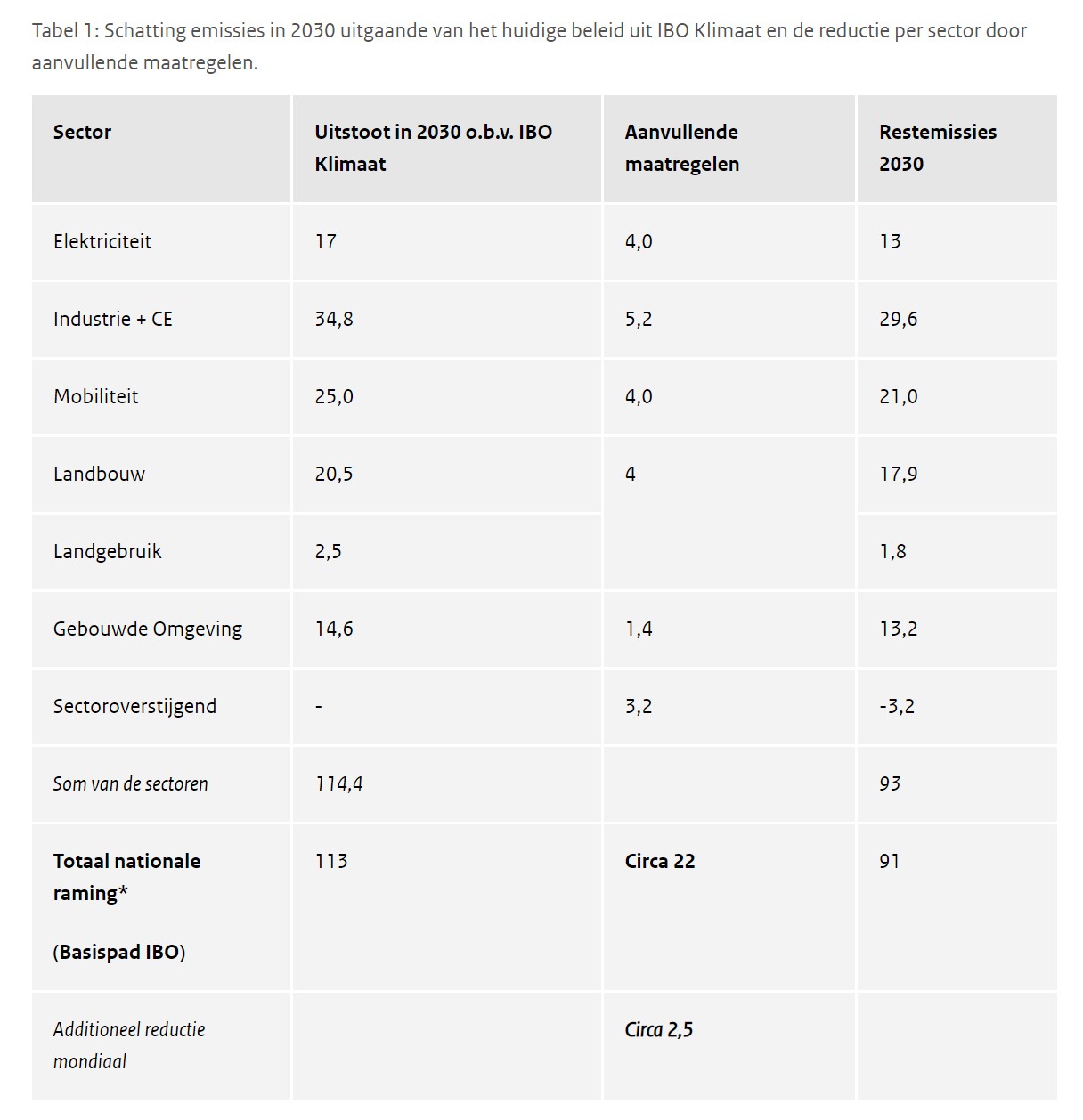 De doelstelling is om in Nederland in 2030 ten minste 55% minder CO2 uit te stoten ten opzichte van 1990. Daarbij wil het kabinet zekerheid inbouwen, zodat tegenvallers kunnen worden opgevangen. Het kabinet mikt daarom in de praktijk op een hogere opgave, wat neerkomt op circa 60%. Om het resterende gat te dichten komt het kabinet met een pakket van 22 megaton, in aanvulling op het coalitieakkoord. Van iedere sector een extra bijdrage gevraagd. De omvang van die bijdrage is gebaseerd op de mogelijkheden om binnen de sectoren tot 2030 de CO2-uitstoot sneller omlaag te brengen.