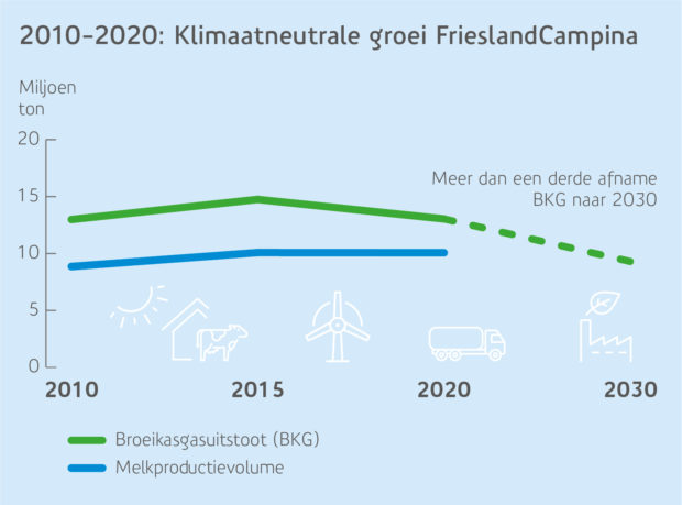 In 2010 stelde Koninklijke FrieslandCampina een duidelijk doel voor zijn duurzaamheidsreis. De productie richting 2020 zou kunnen groeien, zolang de broeikasgasuitstoot in 2020 niet hoger zou zijn dan in 2010. FrieslandCampina noemde dat ‘klimaatneutrale groei’. Vandaag heeft FrieslandCampina – de combinatie van de coöperatie van meer dan 17.000 leden-melkveehouders en het bedrijf – deze belangrijke mijlpaal bereikt: de totale gerapporteerde uitstoot van broeikasgassen in 2020 is lager dan in 2010, terwijl het productievolume in dezelfde periode met 13,6% groeide.