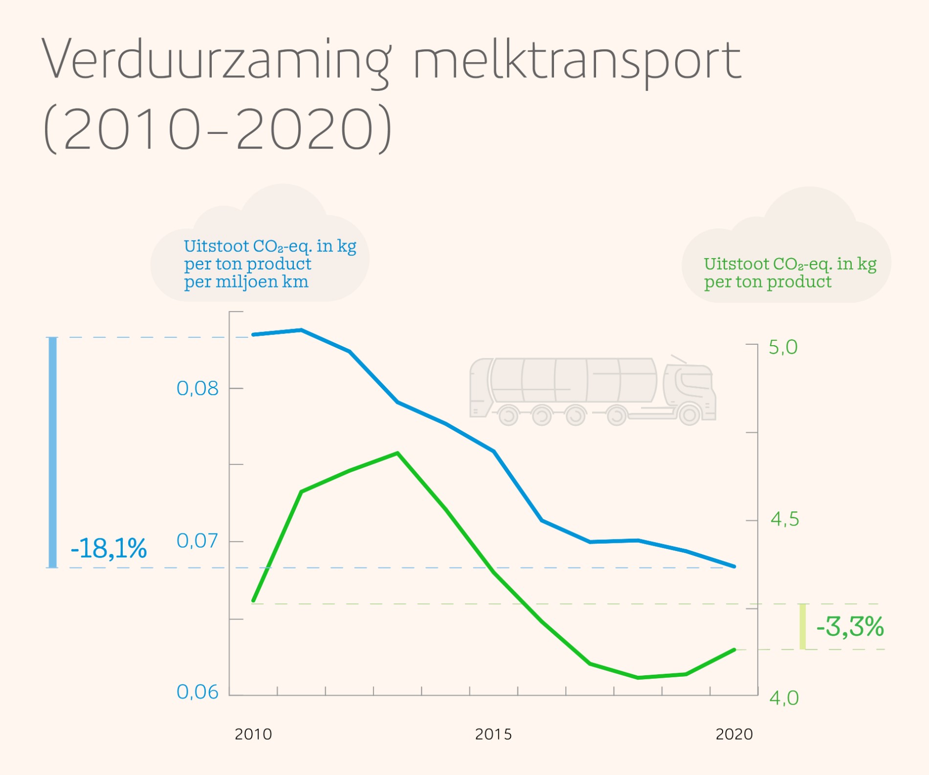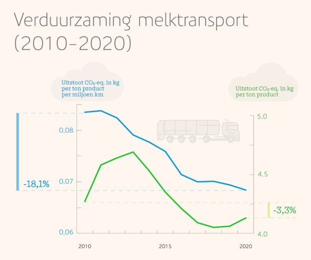 [2] 18,1% per ton product. Omdat er door de toename van het melkaanbod in totaal meer kilometers werden gemaakt, nam de absolute uitstoot af met 3,3% per ton product.