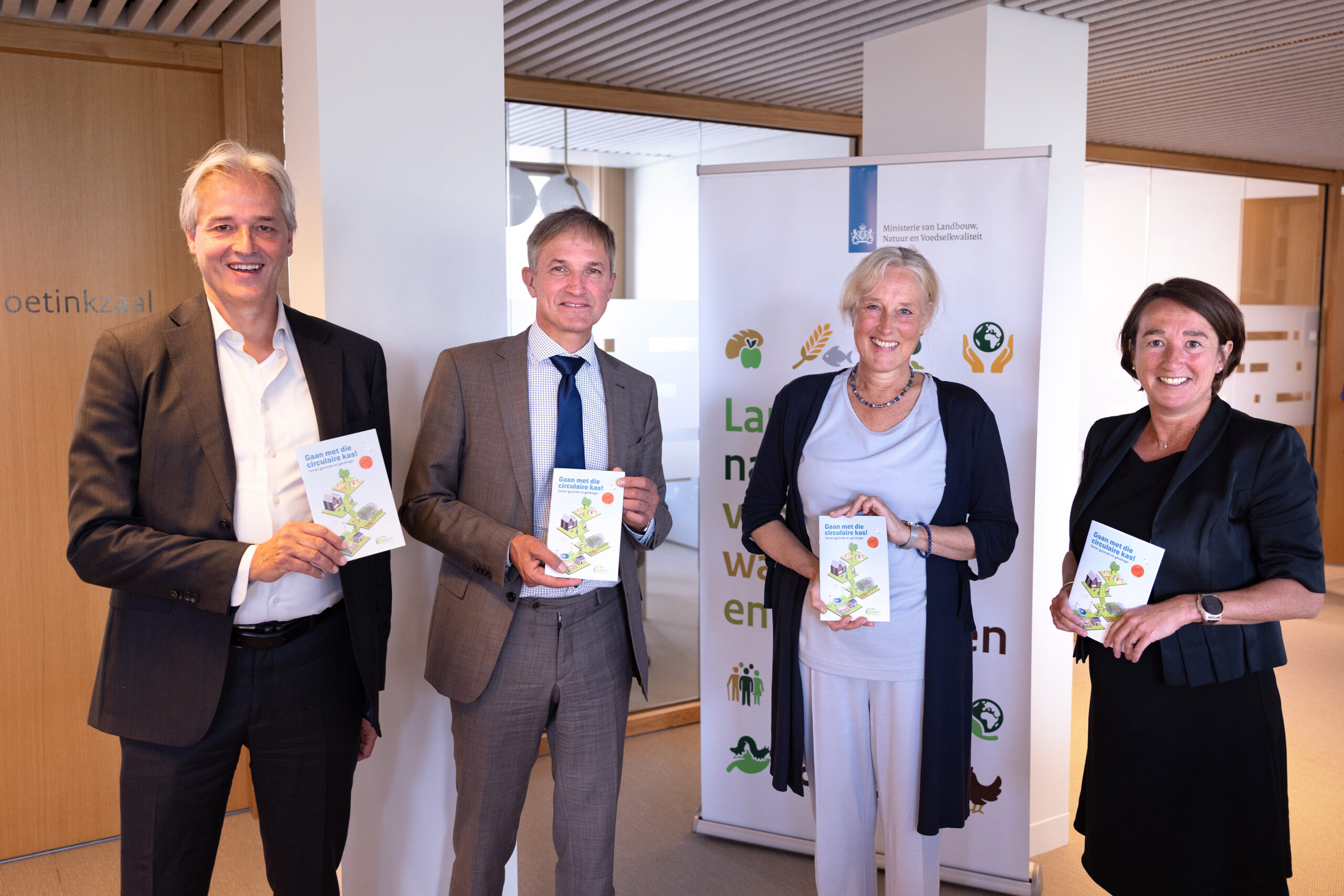 DEN HAAG – Voorzitter Adri Bom-Lemstra (2e R) van Glastuinbouw Nederland biedt een petitie over de circulaire kas aan het ministerie van LNV aan. COPYRIGHT DIRK HOL