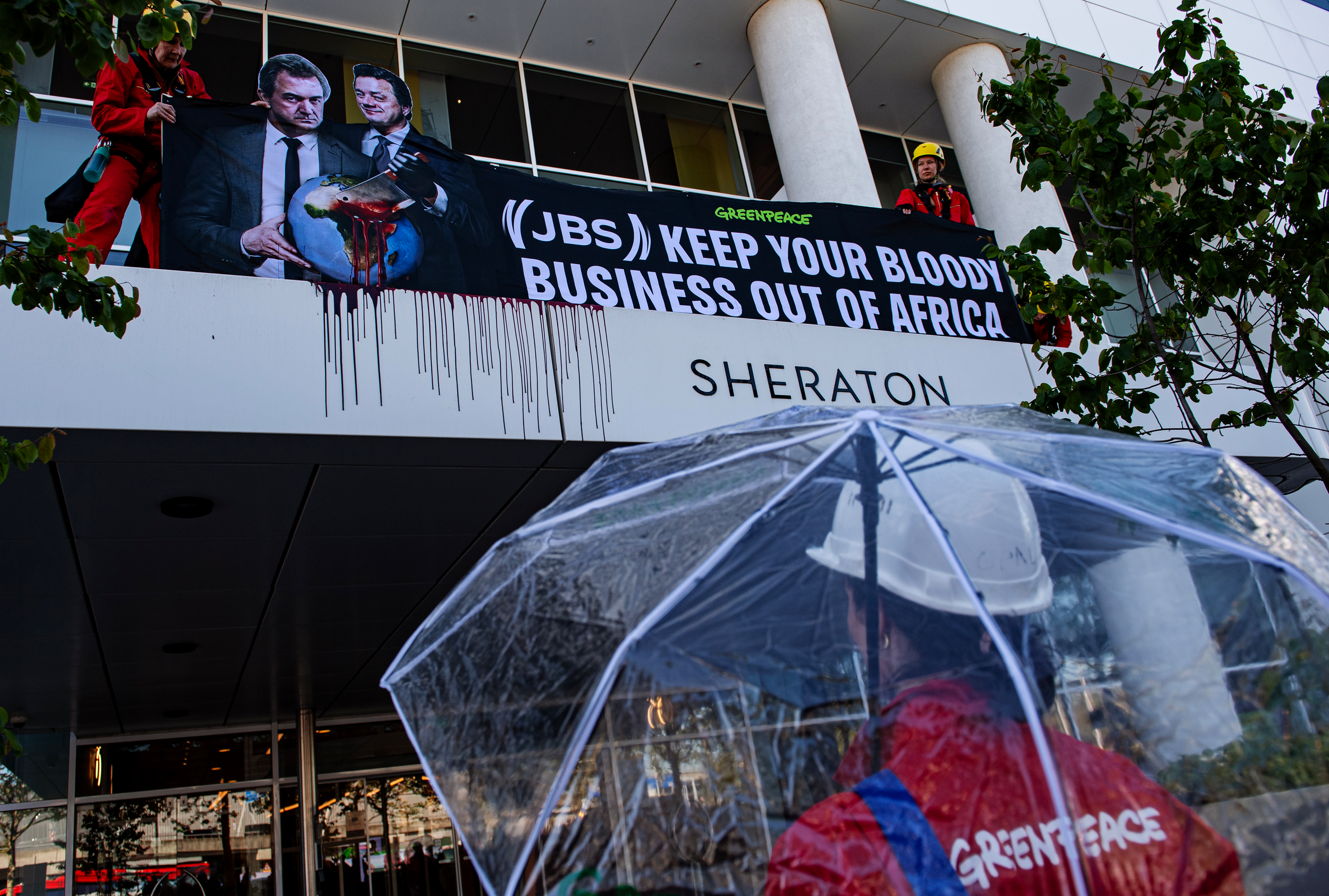 Een groep van 48 Greenpeace-actievoerders heeft de eerste aandeelhoudersvergadering van vleesgigant JBS in Nederland verstoord. De actievoerders hingen een spandoek met druipend nepbloed en de tekst: ‘JBS: Keep your bloody business out of Africa’ aan het Sheraton hotel op Schiphol, waar de vergadering plaatsvond. In de hal van het hotel wordt ook een metershoog spandoek met dezelfde tekst opgehangen. De actievoerders betraden de vergaderzaal en Greenpeace directeur Marieke Vellekoop bood het informatieverzoek aan de aandeelhouders van JBS aan, wat de eerste stap is naar juridische actie tegen de uitbreidingsplannen van JBS. Greenpeace wil dat JBS van de destructieve groeiplannen afziet. De aandeelhoudersvergadering is stilgelegd.