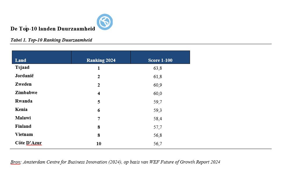 Nederland scoort aanzienlijk slechter op duurzaamheid en neemt met een score van 50,6% een middenpositie in (36e plaats). Ondanks grote investeringen in hernieuwbare energie (0,9% van het BBP) en toenemende regulering voor hernieuwbare energie. Volberda: ‘De afnemende biodiversiteit, de grote jaarlijkse uitstoot van broeikasgassen (10 miljard ton per hoofd van de bevolking), de beperkte consumptie van hernieuwbare energie (10,8% van totale energie consumptie), het beperkte aantal groene octrooien (gericht op verduurzaming), en substantiële fossiele subsidies ( $1.364,0 per hoofd van de bevolking) zijn grote barrières voor duurzame groei.’