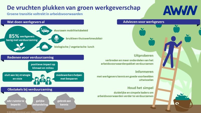 AWVN ziet verduurzaming als hét volgende thema op het gebied van arbeidsvoorwaarden. Werkgevers hebben een belangrijke voorbeeldfunctie in de maatschappij en richting hun medewerkers. Daarom kunnen juist zij de impact van verduurzaming verbreden en vergroten. AWVN merkt op dat werkgevers intrinsiek gemotiveerd zijn om aan de slag te gaan met het verduurzamen van arbeidsvoorwaarden en daarmee hun rol in de klimaattransitie pakken. Dit doen zij niet alleen als ondernemer, maar ook als werkgever.