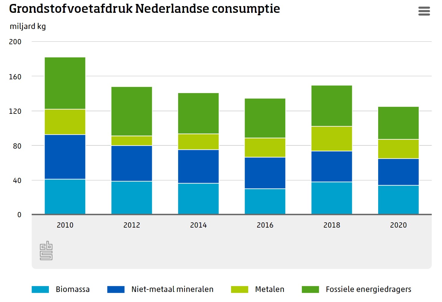 De grondstofvoetafdruk is de hoeveelheid grondstoffen die gewonnen wordt voor alle producten en diensten die Nederlanders consumeren. Vooral het gebruik van fossiele brandstoffen en niet-metaalmineralen, zoals zand en grind, is in het afgelopen decennium gedaald. Of deze dalende trend doorzet is nog onbekend. Het jaar 2020 past in de dalende trend, maar dat jaar was bijzonder vanwege corona. In 2018, het voorlaatste jaar waarin de voetafdruk werd gemeten, lag het gebruik van biomassa, metalen en fossiele brandstoffen hoger dan in 2012.