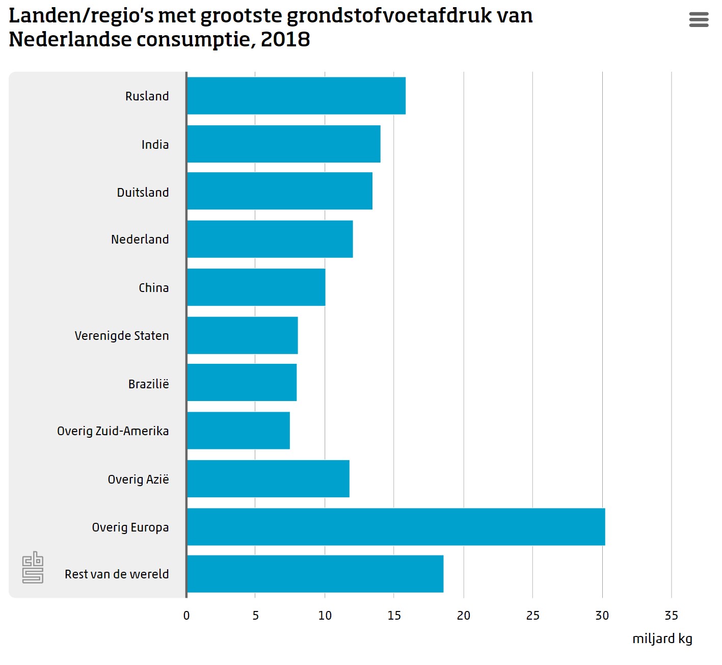 Voor de grondstofvoetafdruk is ook Duitsland belangrijk (9 procent in 2018), maar 24 procent van de totale voetafdruk betreft winning in Azië, vooral in India en China. Ook Brazilië is belangrijk in de grondstofwinning voor de Nederlandse consumptie (ruim 5 procent). De grondstofvoetafdruk van de Nederlandse consumptie strekt zich uit over veel verschillende landen: ruim 30 procent werd gerealiseerd in landen die niet in de top 10 staan. Twee derde daarvan werd gerealiseerd in andere Europese landen, de rest voornamelijk in (Zuid-) Afrika.