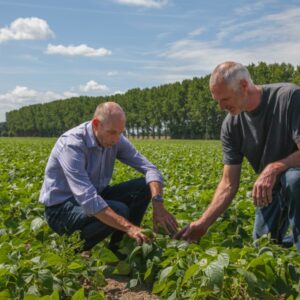Foto: De telers Pieter Pateer (links) en Anne Douwe van der Zee (rechts) uit Zeeuws-Vlaanderen telen dit jaar voor HAK bruine bonen volgens het On the way to PlanetProof schema. Daarmee is de groentefabrikant uit Giessen de eerste die bruine bonen met het duurzaamheidskenmerk op de markt brengt.