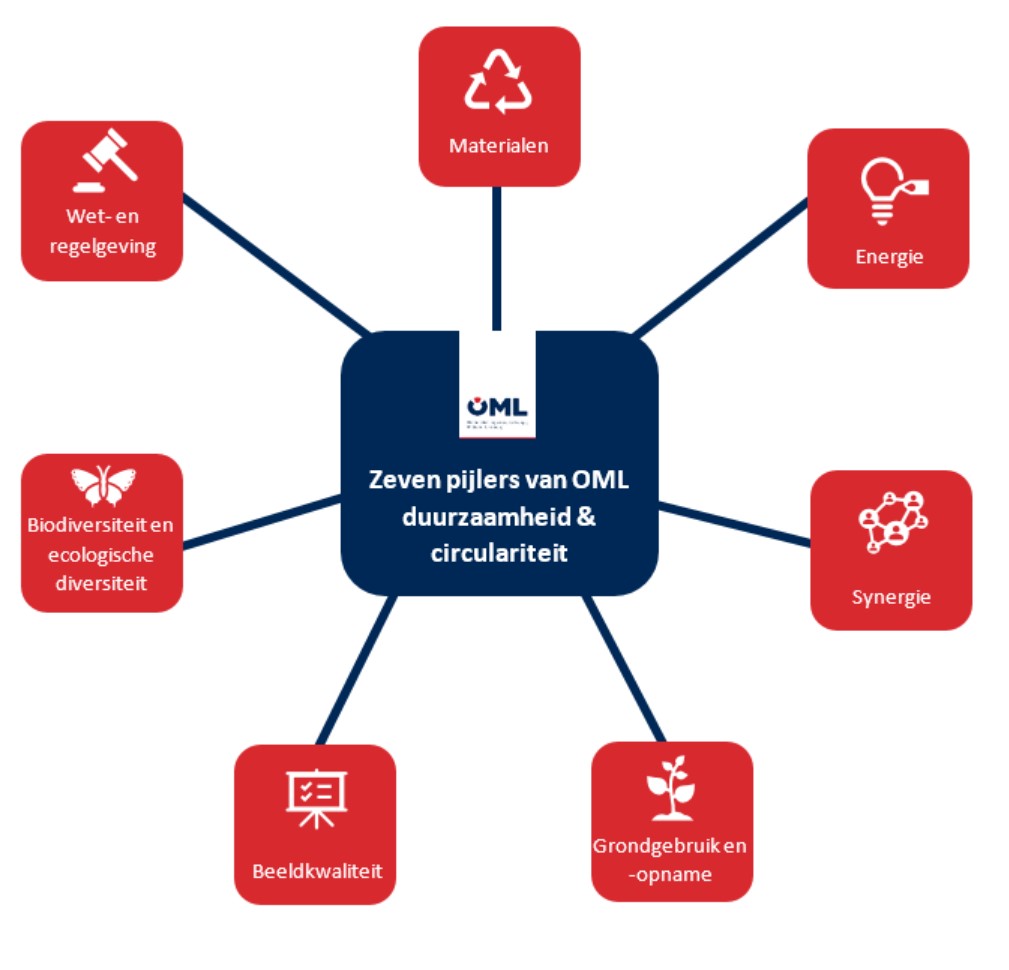 OML is dagdagelijks bezig met de juiste huisvesting op de juiste plek voor bestaande en nieuwe bedrijven in Midden-Limburg op deze terreinen. Hans Coppus: “Zeven pijlers van duurzaamheid en circulariteit helpen ons om onze ambities tastbaar en uitvoerbaar te maken. Voor onszelf en partijen zoals ondernemers, omwonenden, overheden en adviesorganen, die met ons te maken krijgen.” Met de zeven pijlers wil OML bewustzijn creëren rondom duurzaam, klimaatneutraal en circulair ondernemen. Met als doel: bijdragen aan de klimaatdoelstelling 2050 van de overheid.