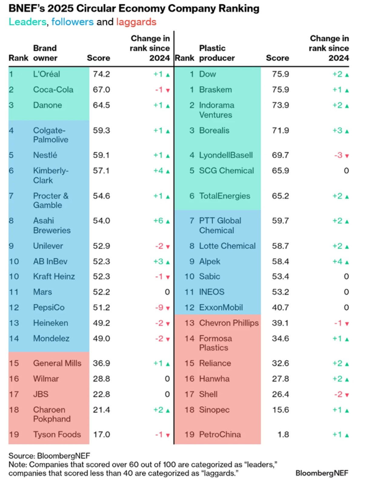 De Circular Economy Company Ranking van BNEF meet de ambities van geselecteerde bedrijven op het gebied van circulaire economie, gebaseerd op de publiekelijk bekendgemaakte doelstellingen en toezeggingen uit hun jaarverslagen van 2024. Zowel merkeigenaren als plasticproducenten worden ingedeeld in drie categorieën – koplopers, volgers en achterblijvers – op basis van de rankingmethodologie van BNEF.