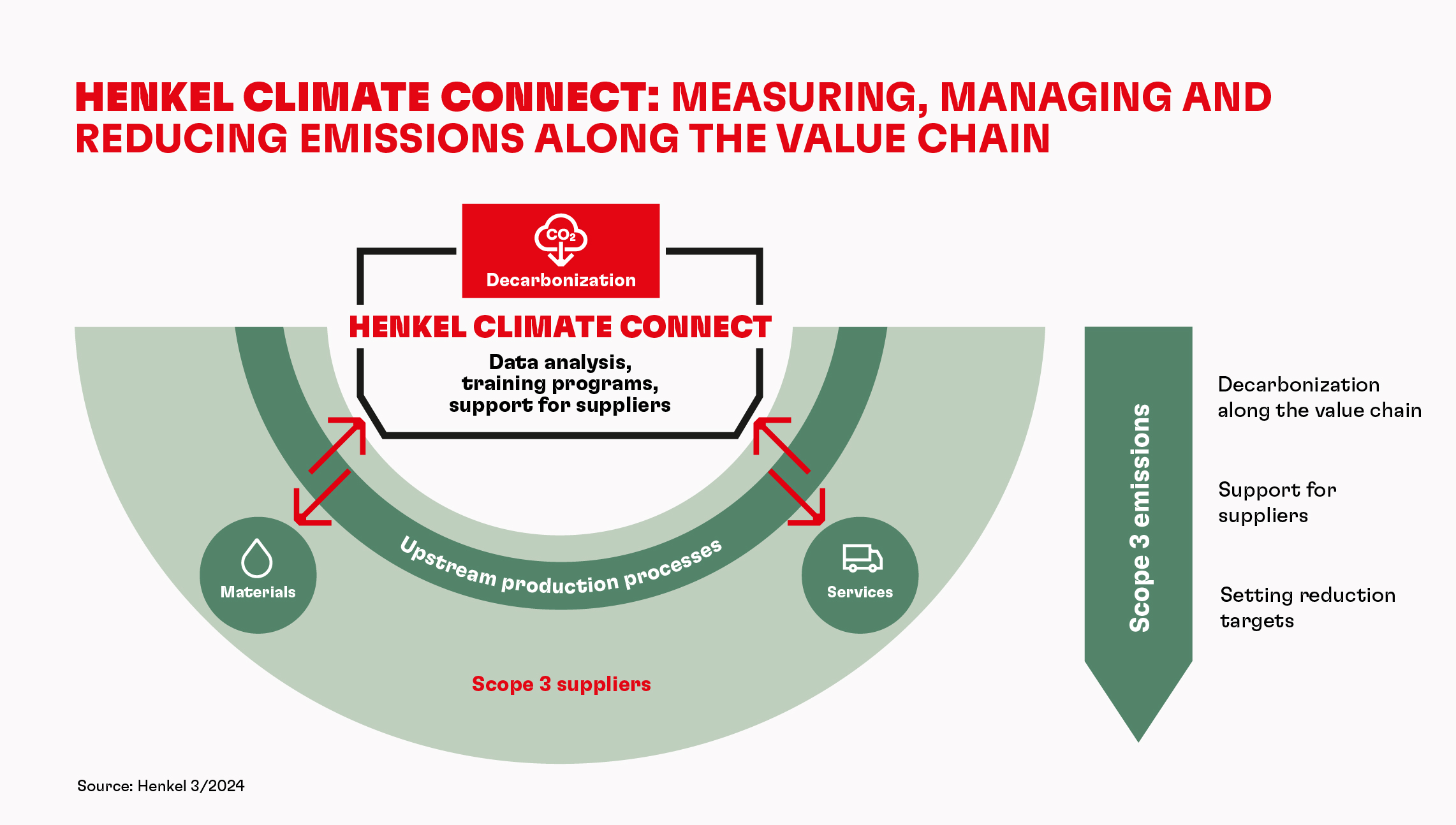 Om de evaluatie van de CO2 emissies in de upstream toeleveringsketen naar een hoger niveau te tillen, heeft Henkel een uitgebreid engagementprogramma gelanceerd voor zijn wereldwijde leveranciers, genaamd “Climate Connect”. Het programma heeft tot doel de decarbonisatie in de hele waardeketen te bevorderen door het verzamelen van emissiegegevens, gezamenlijk gedefinieerde acties voor reductie en voortdurende bijscholing.