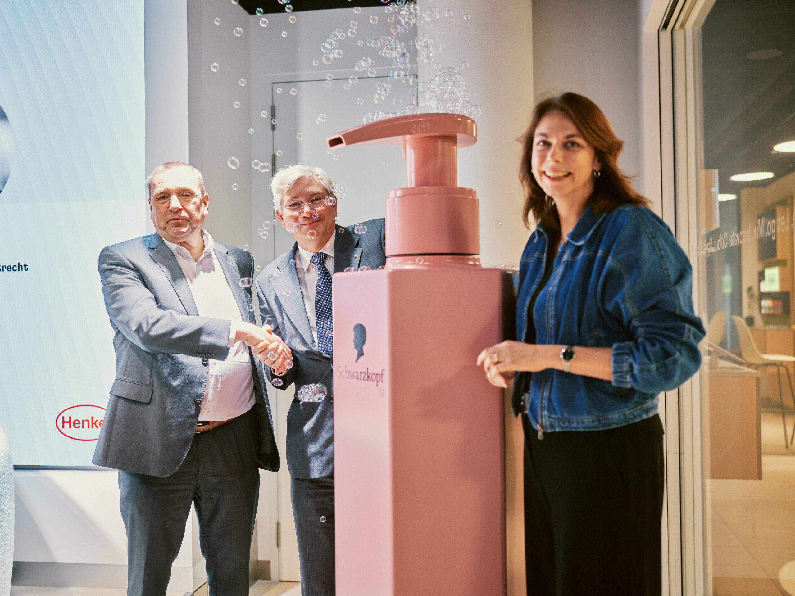 v.l.n.r. Geert Luyckx (President Henkel Benelux), André van Schie (Gedeputeerde Provincie Utrecht) en Liesbeth van Dijk (General Manager Henkel Consumer Brands Professional)