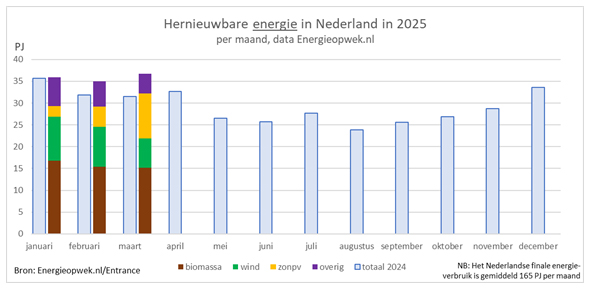 In kwartaal één van 2025 was 48,5% van alle electriciteit hernieuwbaar (met aftrek effect van circa 1,5% punt vanwege afschakelen zonPV en wind op land), tegen 48,2% in het eerste kwartaal van 2024, niet genormaliseerd.