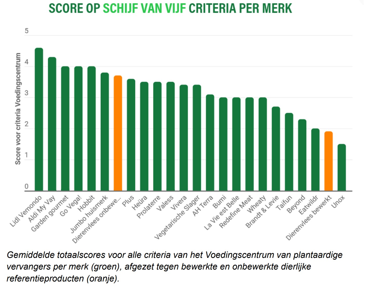 Hoewel vleesvervangers over de hele linie vooruitgaan en beter scoren dan vlees, deden sommige merken het beter dan anderen. Met name de supermarkt-huismerken komen goed uit de bus. Het Lidl huismerk scoort veruit het beste: 10 van de 11 onderzochte producten (91%) voldoet aan alle criteria van de Schijf van Vijf. Lidl wordt op de voet gevolgd door Aldi, Garden Gourmet, Go Vega! (het huismerk van de Superunie supermarkten) en Jumbo. Al deze huismerken scoren gemiddeld beter dan onbewerkt dierlijk vlees.