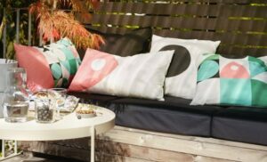 De MUSSELBLOMMA collectie is een ode aan de schoonheid van de natuur. De producten hebben een speels design in de kleuren van de zee: groen en turkoois. Het zijn simpele en moderne patronen met cirkels, vierkanten en driehoeken, gecombineerd met een figuur dat doet denken aan een vis. De kussenslopen hebben twee verschillende kanten waardoor je kan afwisselen. De producten kunnen zowel binnen als buiten worden gebruikt.