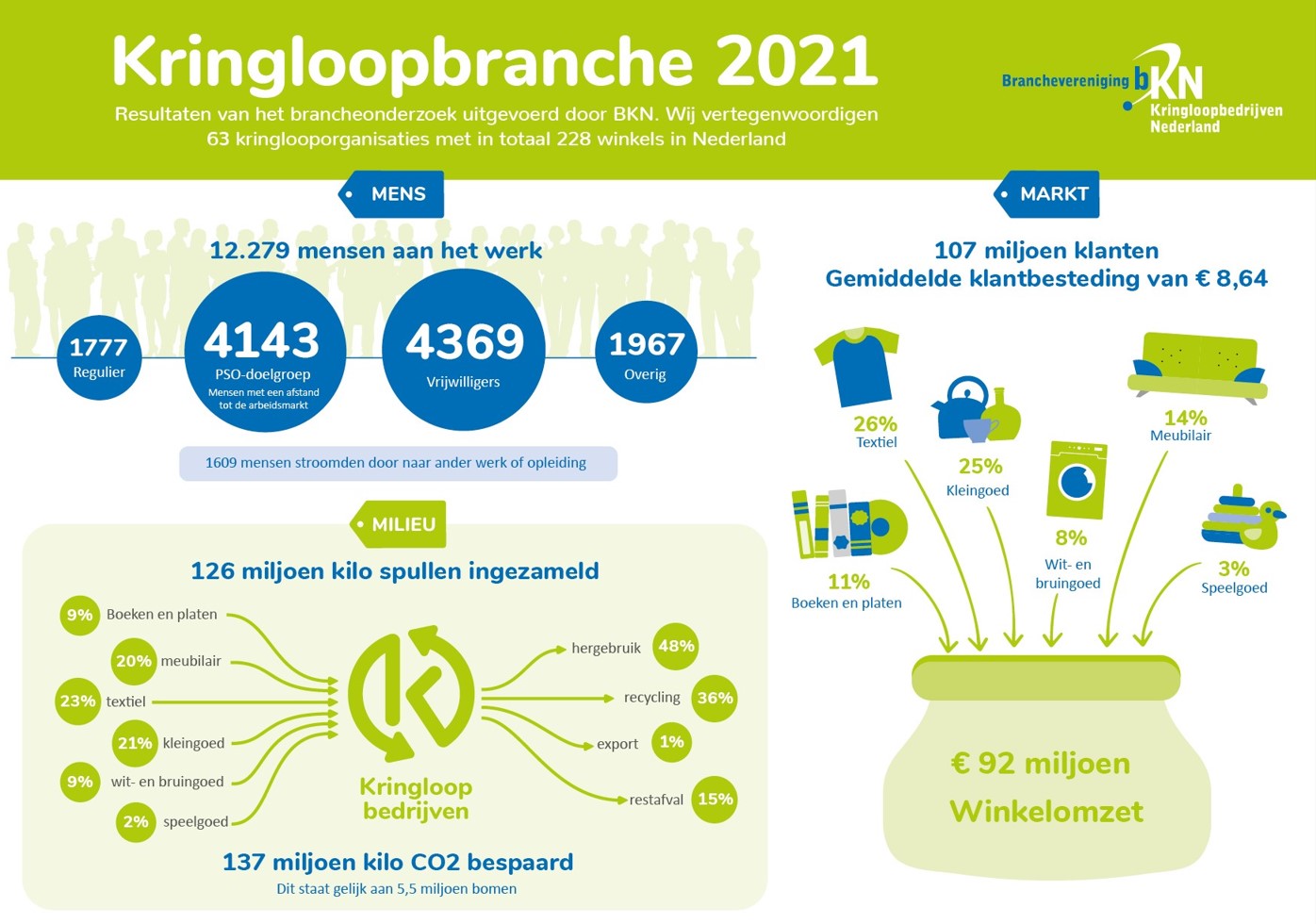 Ondanks een veelbewogen jaar vol maatregelen die een negatieve invloed hadden op dagelijkse bedrijfsvoering, bleef de kringloopbranche in 2021 flink impact maken. Dat is duidelijk zichtbaar door de 12.280 mensen die werkzaam zijn binnen de branche en de besparing van 137 miljoen kg CO2 door hergebruik en recycling van goederen. Dit blijkt uit cijfers van het brancheonderzoek uitgevoerd door de Branchevereniging Kringloopbedrijven Nederland (BKN).