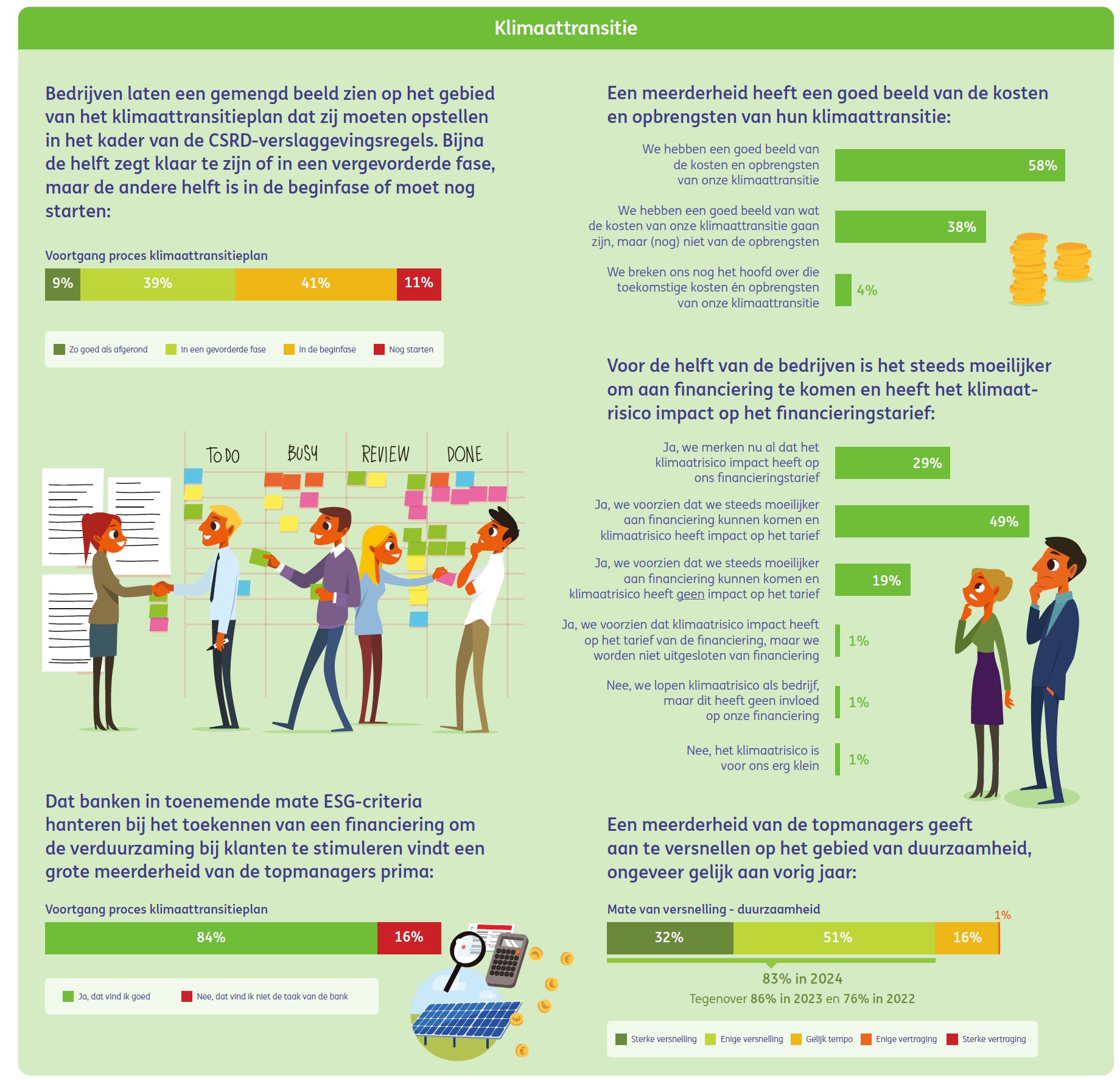 De klimaattransitie van het bedrijf heeft invloed op de kapitaalmarkt- en bankfinanciering, omdat financiële instellingen aan toezichthouders moeten gaan rapporteren over de klimaattransitie van hun zakelijke klanten. Van de topbestuurders verwacht 49% dat ze moeilijker aan financiering kunnen komen en dat hun klimaatrisico een impact zal hebben op het tarief. Zo’n 29% merkt nu al dat het klimaatrisico hun financieringstarief beïnvloedt. Dat banken in toenemende mate ESG-criteria hanteren bij het toekennen van een financiering om de verduurzaming bij klanten te stimuleren vindt een grote meerderheid (84%) van de topmanagers prima.