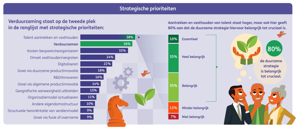 Uit het onderzoek blijkt dat 68% van de Nederlandse ondernemingen dit jaar sneller verwacht te verduurzamen dan vorig jaar. Verduurzaming staat dan ook op de tweede plek in de ranglijst met belangrijkste strategische prioriteiten van Nederlandse bedrijven. Voor 36% van de ondernemingen is verduurzamen de komende twaalf maanden het meest relevant. Alleen het aantrekken en vasthouden van talent staat hoger, met 38%. Maar ook hierbij speelt verduurzaming een rol: maar liefst 80% van de ondervraagden stelt dat de duurzame strategie belangrijk tot cruciaal is voor het aantrekken van personeel. Als derde prioriteit worden kostenbesparingen genoemd.