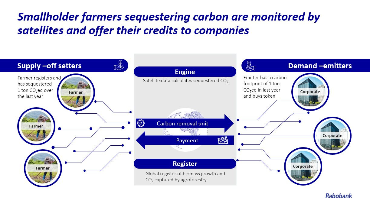 In het project vinden boeren en bedrijven elkaar om vraag en aanbod van CO2-opslag te matchen. Doordat boeren in ontwikkelingslanden bomen planten op hun land, kan de koolstofopslag van deze bomen via het platform dat Rabobank samen met Microsoft ontwikkelde verkocht worden aan grote bedrijven. Zij betalen vervolgens een vergoeding aan de boer voor de geleverde opslag. Eenmaal aangekocht is de compensatie niet verhandelbaar. Het initiatief is gestoeld op de oorsprong van Rabobank als boerenleenbank en Microsofts positie als leider in technologie. Dankzij de combinatie van remote sensing, artificial intelligence (AI) en machine learning biedt het platform een wereldwijd schaalbare en transparante oplossing tegen klimaatverandering die tevens de positie van boeren versterkt. Naar verwachting gaat het platform in 2022 live.