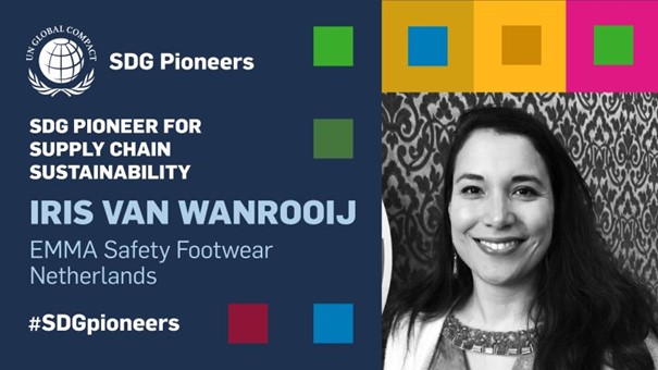 Gepubliceerd 2 juni 2022 op 605 × 340 in Iris van Wanrooij (EMMA Safety Footwear) SDG Pioneer in Supply Chain Sustainability by UN Global Compact