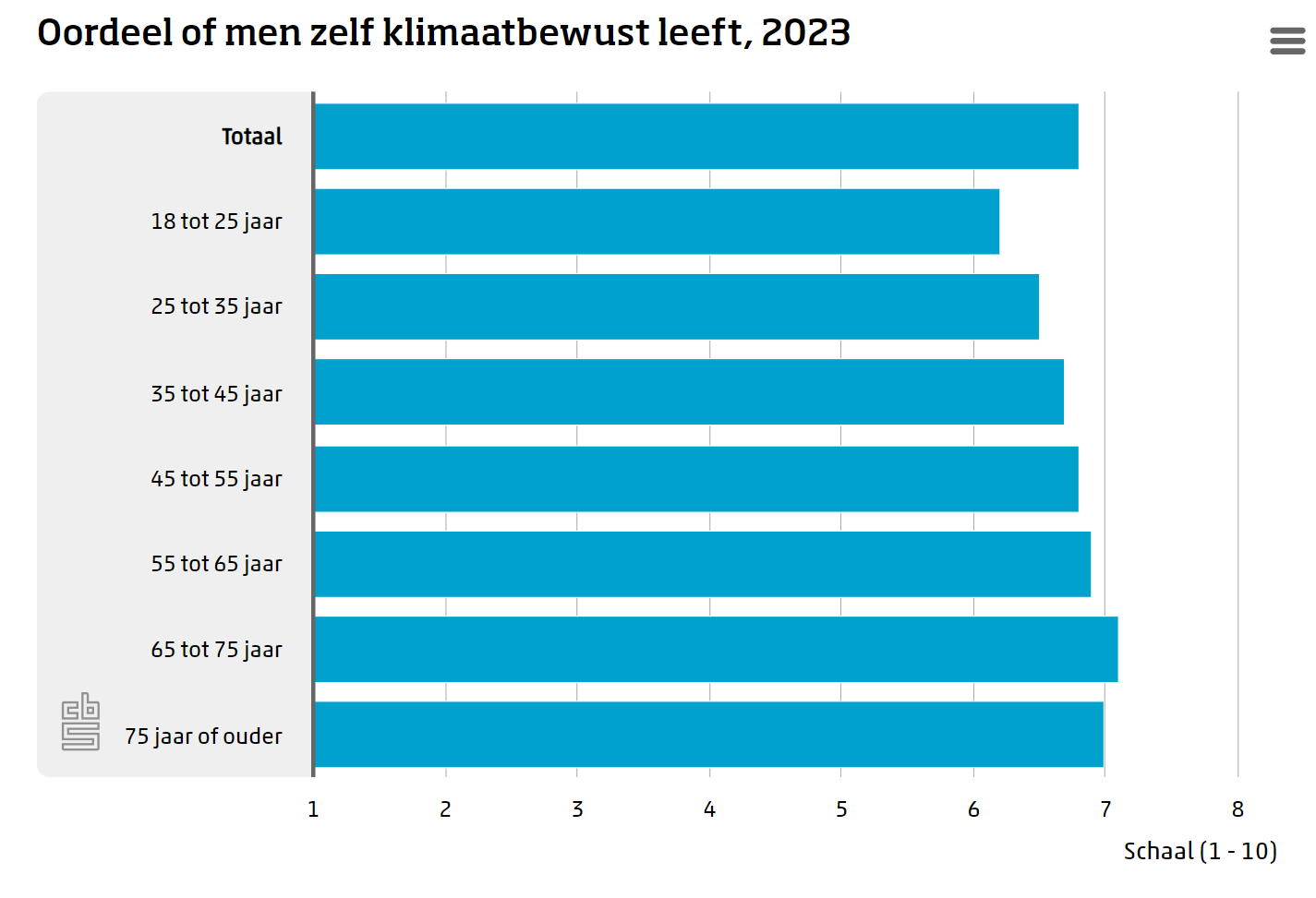 Jongeren tussen de 18 en 25 jaar gaven zichzelf gemiddeld een 6,2 als het gaat om hoe klimaatbewust zij leven (op een schaal van 1 ’ik leef niet klimaatbewust’ tot en met 10 ’ik leef heel erg klimaatbewust’). Deze beoordeling stijgt naarmate de leeftijd toeneemt. Bij de oudste leeftijdsgroepen was dit gemiddeld een 7.