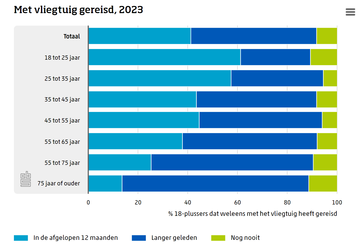 Jongeren gedroegen zich doorgaans minder milieuvriendelijk, bijvoorbeeld door hun vlieggedrag. In 2023 zei 61 procent van de 18- tot 25-jarigen in de afgelopen 12 maanden met het vliegtuig te hebben gereisd. Ook 25- tot 35-jarigen vlogen relatief veel. Van de 35- tot 55-jarigen zei ongeveer 45 procent met het vliegtuig te hebben gereisd. Naarmate men ouder wordt nam het aandeel vliegreizigers af, tot 14 procent bij de 75-plussers. Vaak vloog men voor een vakantie of citytrip. Ongeveer 20 procent van de jongere leeftijdsgroepen is buiten Europa op vakantie geweest in de afgelopen 12 maanden. Van de 75-plussers was dat 4 procent.