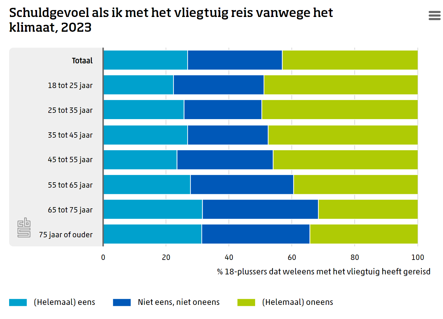 Van de 18- tot 25-jarigen die weleens met het vliegtuig reizen, zei 22 procent dat zij zich hier schuldig over voelen vanwege het klimaat. Ongeveer de helft van deze leeftijdsgroep zei deze schuldgevoelens niet te hebben. De mate van vliegschaamte onder jongeren is vergelijkbaar met die van 25- tot 65-jarigen. 65-plussers die weleens met het vliegtuig reizen, voelen zich hier vaker schuldig over.