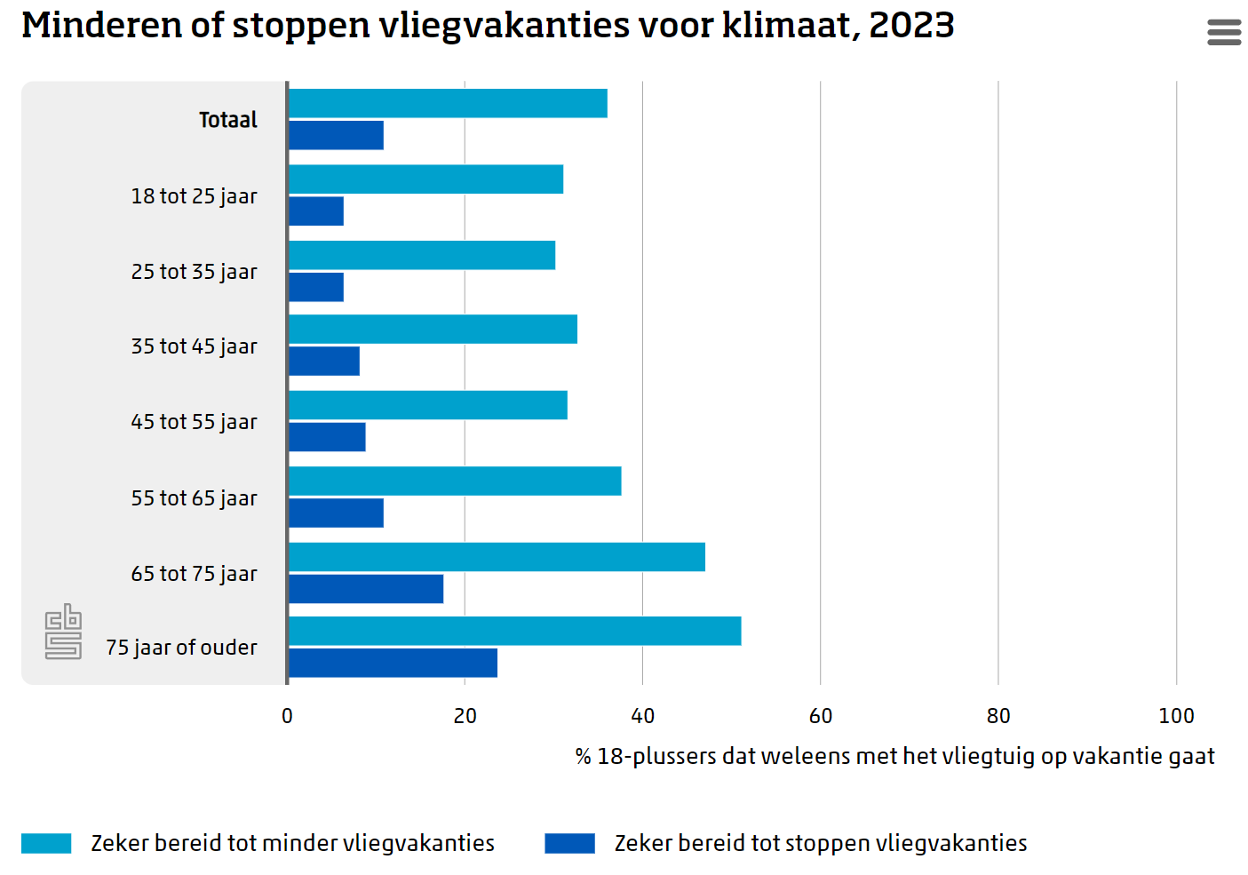 Ruim 30 procent van de 18- tot 25-jarigen die weleens met het vliegtuig op vakantie gaan, is zeker bereid om dit minder vaak te doen vanwege het klimaat. Dit is vergelijkbaar met de 25- tot 65-jarigen. Van de 65-plussers die weleens op vliegvakantie gaan, is ongeveer de helft hiertoe bereid.