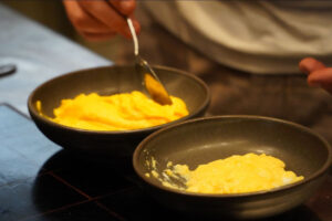 Ruim twee jaar hebben de kippenboeren van Kipster in het geheim aan het vegan ei ontwikkeld. Het is een lange weg om het ongeëvenaarde mondgevoel van een roerei met plantaardige ingrediënten na te bootsen. Om te komen waar het vegan ei nu staat, werkt Kipster samen met voedseltechnologen van TOP BV, studenten van Wageningen Universiteit, topkoks en tal van andere partijen, waaronder Flevo Campus.