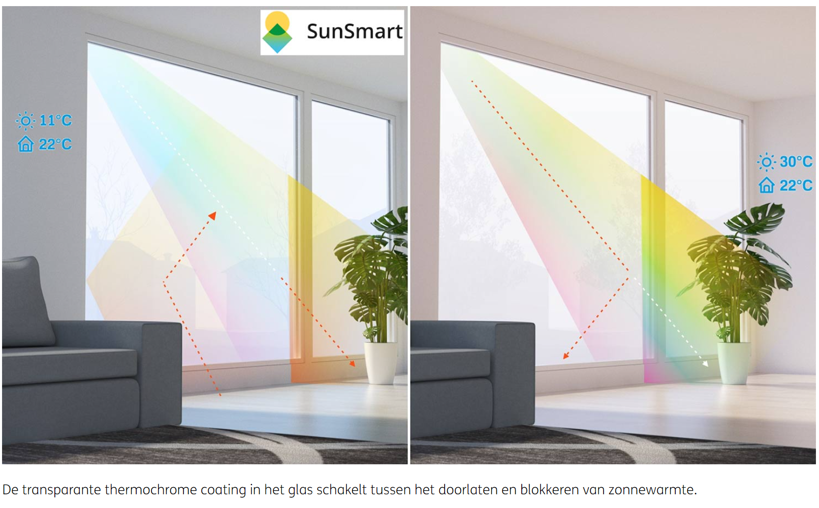 Daarmee is het raam geoptimaliseerd om zoveel mogelijk energie te besparen, terwijl het transparant blijft voor het menselijk oog. Het schakelen gebeurt autonoom en is een intrinsieke eigenschap van het gecoate glas, zodat het raam in gewone kozijnen kan worden geplaatst, zonder speciale installatie-eisen.