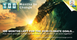 Om tegen 2030 55% vermindering van broeikasgassen te realiseren, start een collectief van klimaatpioniers vandaag, 1 september 2021, een wereldwijd programma: 100 Months to Change. Omdat we nog maar 100 maanden de tijd hebben voor het behalen van de essentiële klimaatdoelen in 2030, wil dit samenwerkingsverband professionals in overheid, bedrijfsleven en onderwijs aanzetten tot daadwerkelijke acties. Opvallend aan dit initiatief is de schaal en vorm waarop wordt ingezet, die er voor zorgen dat veel organisaties inspiratie en handvatten krijgen om snel broeikasgassen te kunnen verminderen. Drijvende kracht is een ervaren team van klimaatpioniers, onder meer bekend van de introductie van de film An Inconvenient Truth, het Nationaal Sustainability Congres en Duurzaam Gebouwd.