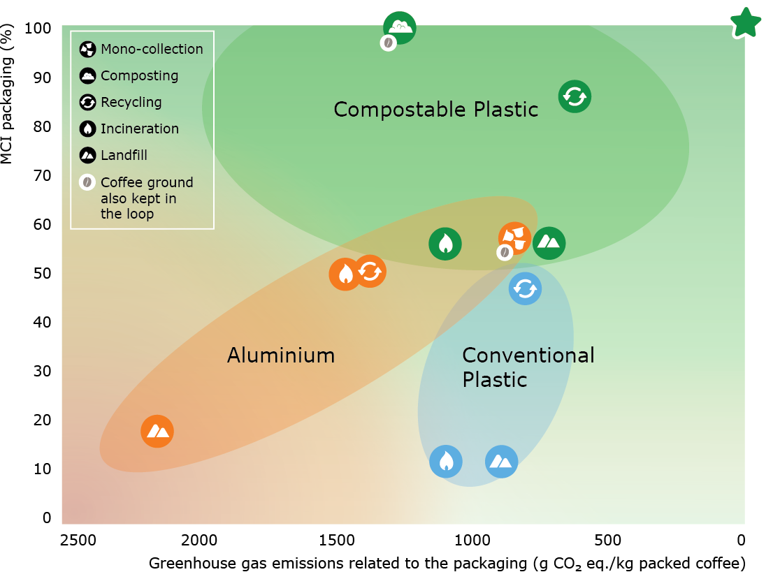 Duurzaamheid, op basis van combinatie van CO₂-uitstoot en circulariteit (MCI), van verschillende types koffiecapsules vergeleken. Beeld: WUR