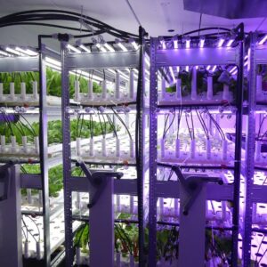 Glowfarms schaalt op van een bescheiden pilotfarm van 110 vierkante meter in Hoorn, naar maar liefst 2700 vierkante meter in Leerdam. De pilot fase heeft bewezen dat Glowfarms de benodigde opbrengst en kwaliteit kan leveren om deze manier van vertical farming grootschalig én rendabel te maken. Daarbij wordt alle praktische ervaring met techniek, groeiproces en efficiëntie uit de pilot nu in het groot toegepast. Én de opschaling is er letterlijk een van formaat: waar er in de proefopstelling één lopende band stond, heeft de nieuwe binnenboerderij plek voor acht veel grotere lopende banden, die samen 1000 kilo sla en kruiden per dag kunnen produceren. Met twintig medewerkers werkt het jonge bedrijf toe naar een volledig geautomatiseerd proces waarbij zaadjes tot planten uitgroeien.