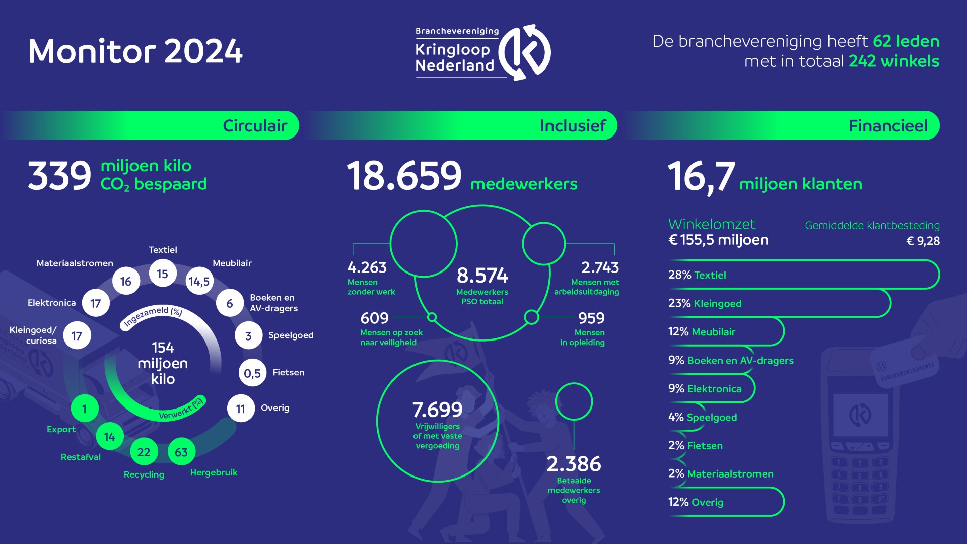 Naast de sociale impact is ook de bijdrage aan de circulaire economie gegroeid. In 2024 werd per vestiging gemiddeld 747.805 kilo aan spullen ingezameld. Van alle goederen die binnenkwamen bij kringlooporganisaties werd 63% hergebruikt, een stijging van 7 procentpunten ten opzichte van 2023. Dit laat zien dat steeds meer producten een tweede, derde of zelfs vierde leven krijgen, en daarmee onnodige verspilling wordt voorkomen.