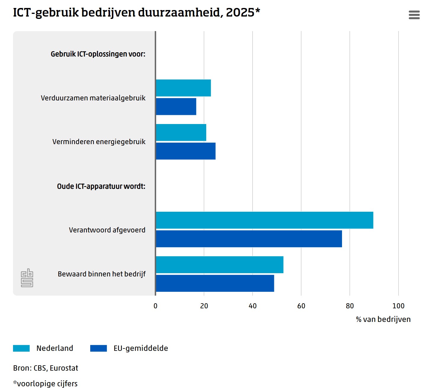 In 2025 gaf 23 procent van de bedrijven aan ICT-oplossingen te gebruiken om het materiaalgebruik te verduurzamen. Deze bedrijven gebruiken bijvoorbeeld software om materiaalverspilling tegen te gaan of voor het automatisch sorteren van afval. Hiermee staat Nederland op de vierde plaats binnen de EU. Ook zorgt 90 procent van de bedrijven voor verantwoorde afvoer van oude ICT-apparatuur, waarmee Nederland op de tweede plaats komt binnen de EU. Dit blijkt uit de nieuwste cijfers over ICT-gebruik bij bedrijven van het Centraal Bureau voor de statistiek (CBS) en Eurostat.