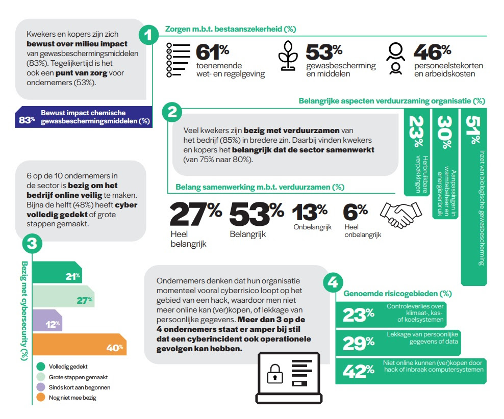 Gewasbescherming is één van de grootste zorgen met betrekking tot de bestaanszekerheid als kweker; 53% van de kwekers geeft aan zich hierover zorgen te maken. Ook toenemende wet- en regelgeving (61%) en personeelstekorten en arbeidskosten (46%) zijn punten van zorg. Opvallend is dat de zorgen over verduurzaming van de sector, in zijn algemeenheid, zijn afgenomen: van 30% in het eerste trendrapport naar 17% nu.