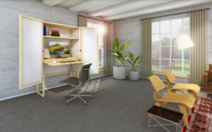 Z-2-Home is een bureaumeubel met een hoogte instelbaar blad voor een passende ergonomische werkhouding voor iedere lichaamslengte tussen 1.65 en 2.05 meter. Ingeklapt neemt het meubel 30 tot 50 centimeter ruimte in beslag vanaf de muur, uitgeklapt verandert het in een ARBO verantwoorde werkplek op maat.