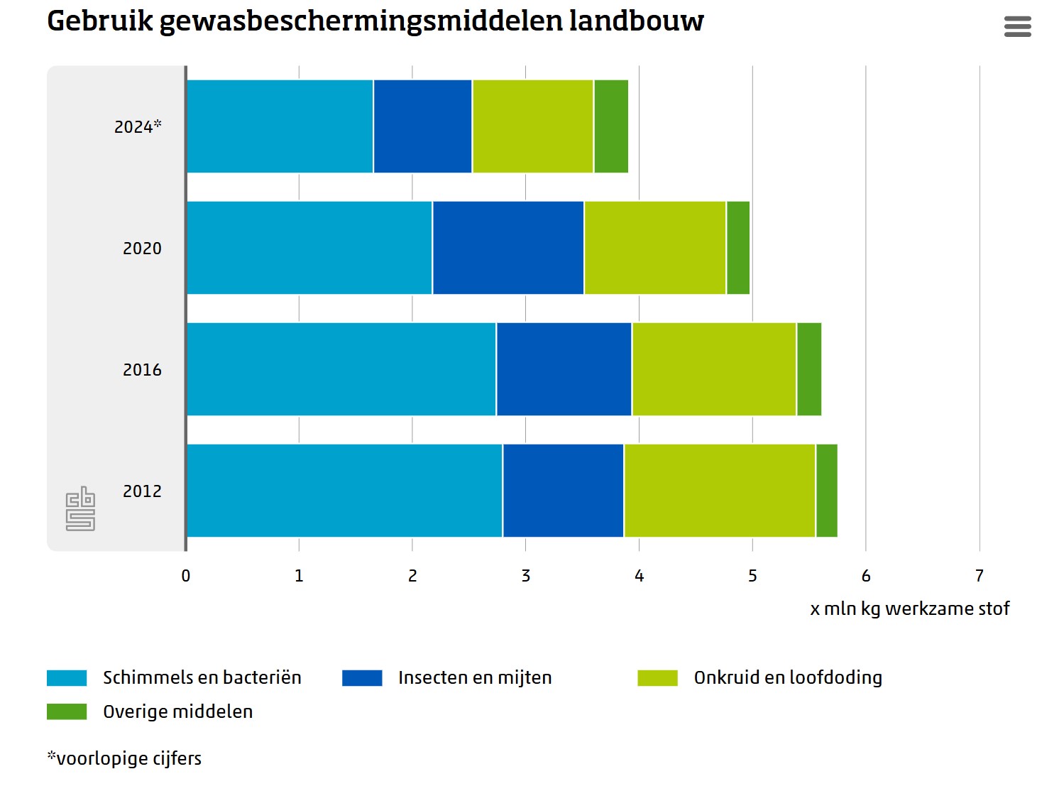 In 2024 gebruikte de landbouw 3,9 miljoen kilogram gewasbeschermingsmiddelen, 22 procent minder dan in 2020. Per hectare gebruikt de landbouw 5,6 kilogram, vier jaar eerder was dat 7,1 kilogram. Om schimmels, onkruid of insecten te bestrijden gebruikt men minder middelen. In de lelieteelt halveerde het bestrijdingsmiddelengebruik ruimschoots. Dit blijkt uit nieuwe cijfers van het Centraal Bureau voor de Statistiek (CBS) over gewasbeschermingsmiddelengebruik bij 44 landbouwgewassen.