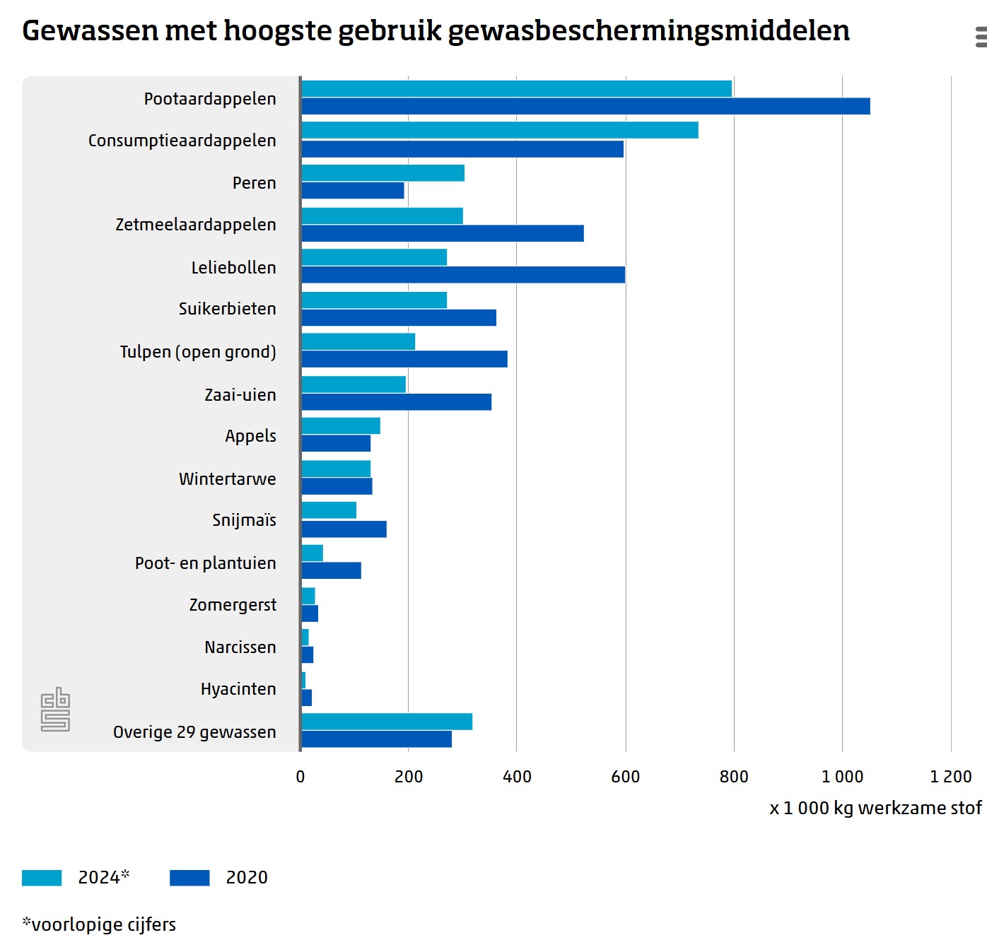 In 2024 gebruikte de landbouw, net als in 2020, meer dan de helft van de gewasbeschermingsmiddelen in de teelt van aardappelen en lelies. Voor de lelieteelt gebruiken bollentelers 273 duizend kilogram middelen, in 2020 was dat 601 duizend kilogram. Lelietelers gebruiken 220 duizend kilogram minder paraffineolie. Het schimmelbestrijdingsmiddel mancozeb is inmiddels verboden; in 2020 gebruikte de lelieteelt daar nog 114 duizend kilogram van. Daardoor is het middelengebruik voor schimmelbestrijding voor lelies 72 procent lager dan in 2020.