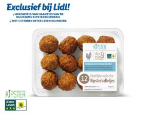 De haantjes van Kipster eten voer dat gemaakt is van reststromen uit de voedingsindustrie, zoals gebroken beschuiten. Met dit circulaire voer verkleint Kipster de milieudruk van hun eieren en vlees. Kipsterkippen waarderen organische reststromen op tot hoogwaardige voedsel voor mensen. Zo leveren de hanen en de hennen een bijdrage aan de strijd tegen voedselverspilling, terwijl een reguliere vleeskip het circulaire voer in deze vorm niet of nauwelijks aankan. Kipster is de enige commerciële pluimveehouder ter wereld die erin slaagt een compleet reststromen-voer voor kippen te maken. De 3 Sterren Beter Leven kipballetjes, gemaakt van hanen- en hennenvlees, zijn bij Lidl verkrijgbaar voor € 2,69 per 240 gram.