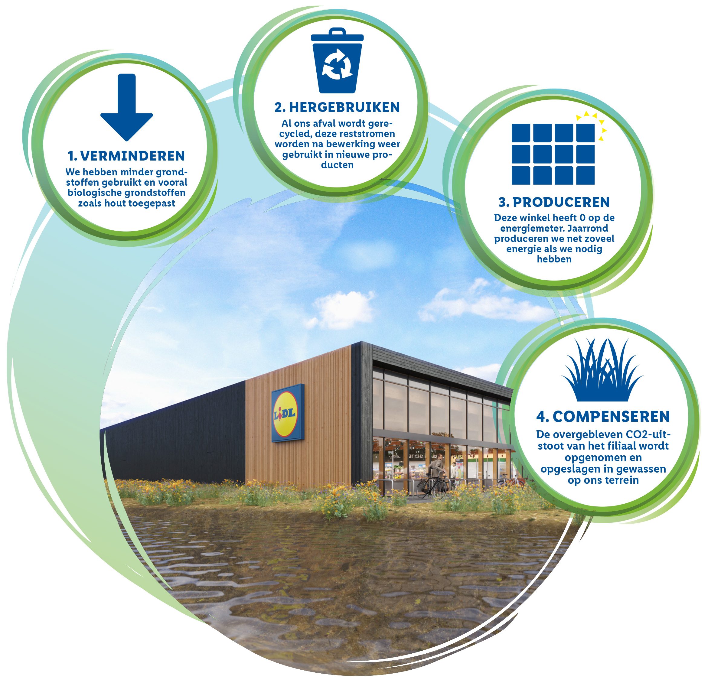 Lidl opent op 7 juli de eerste CO2- en energieneutrale supermarkt van Nederland. De winkel is hiermee de duurzaamste supermarkt van ons land. Momenteel wordt de supermarkt gebouwd in de groene wijk Almere Oosterwold. Met ‘Lidl Zero Almere Oosterwold’ zet Lidl een nieuwe standaard voor henzelf en de toekomst.