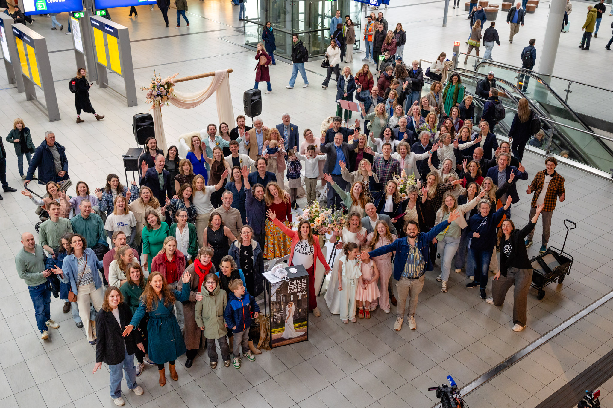 Midden in de stationshal van Utrecht Centraal vond vandaag een opvallende trouwceremonie plaats: een bruiloft waarbij alles draaide om hergebruik. De bruid droeg een gratis tweedehands trouwjurk en ook de gasten verschenen uitsluitend in bestaande of tweedehands kleding. Met deze ceremonie vraagt FREE FASHION aandacht voor de grote milieu-impact van trouwkleding en voor een simpel alternatief: dragen wat er al is.