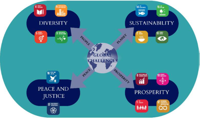 De Global Challenges: Diversity, Sustainability, Peace and Justice, and Prosperity, sluiten direct aan op het 5Ps kader: